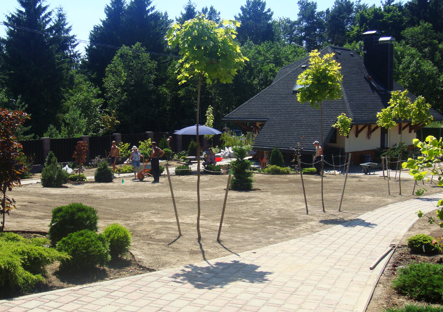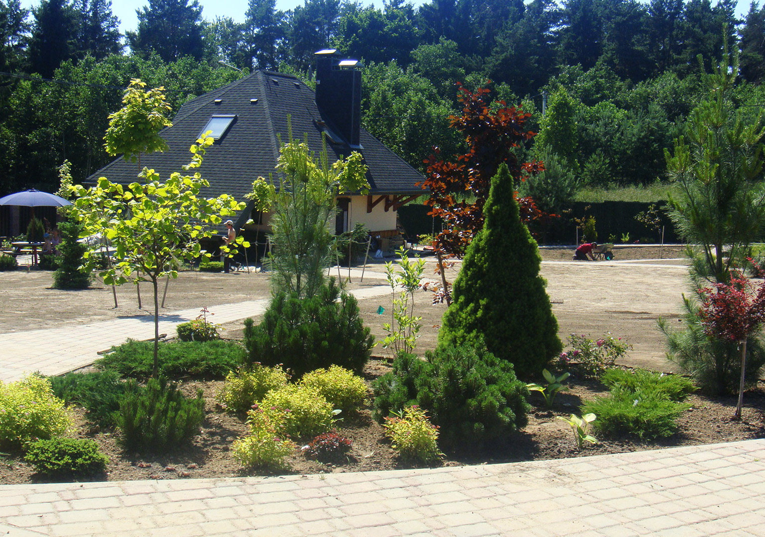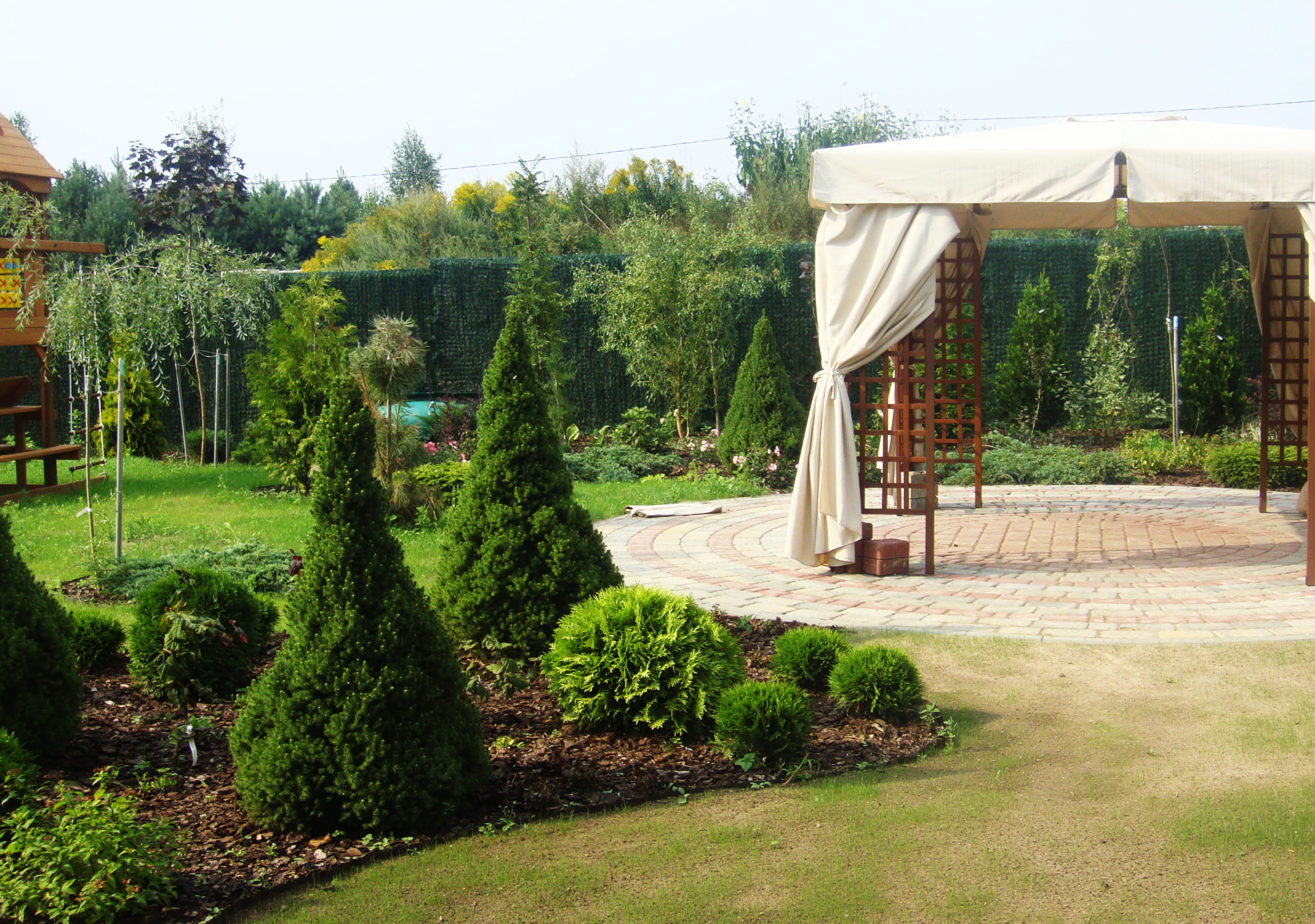 Большой участок для дружной семьи на котором мы сохранили существующие сосны, дополнив декоративными посадками. Разницу высот этого непростого участка подчеркнули естественным склоном в одной стороне и подпорными стенками в другой.