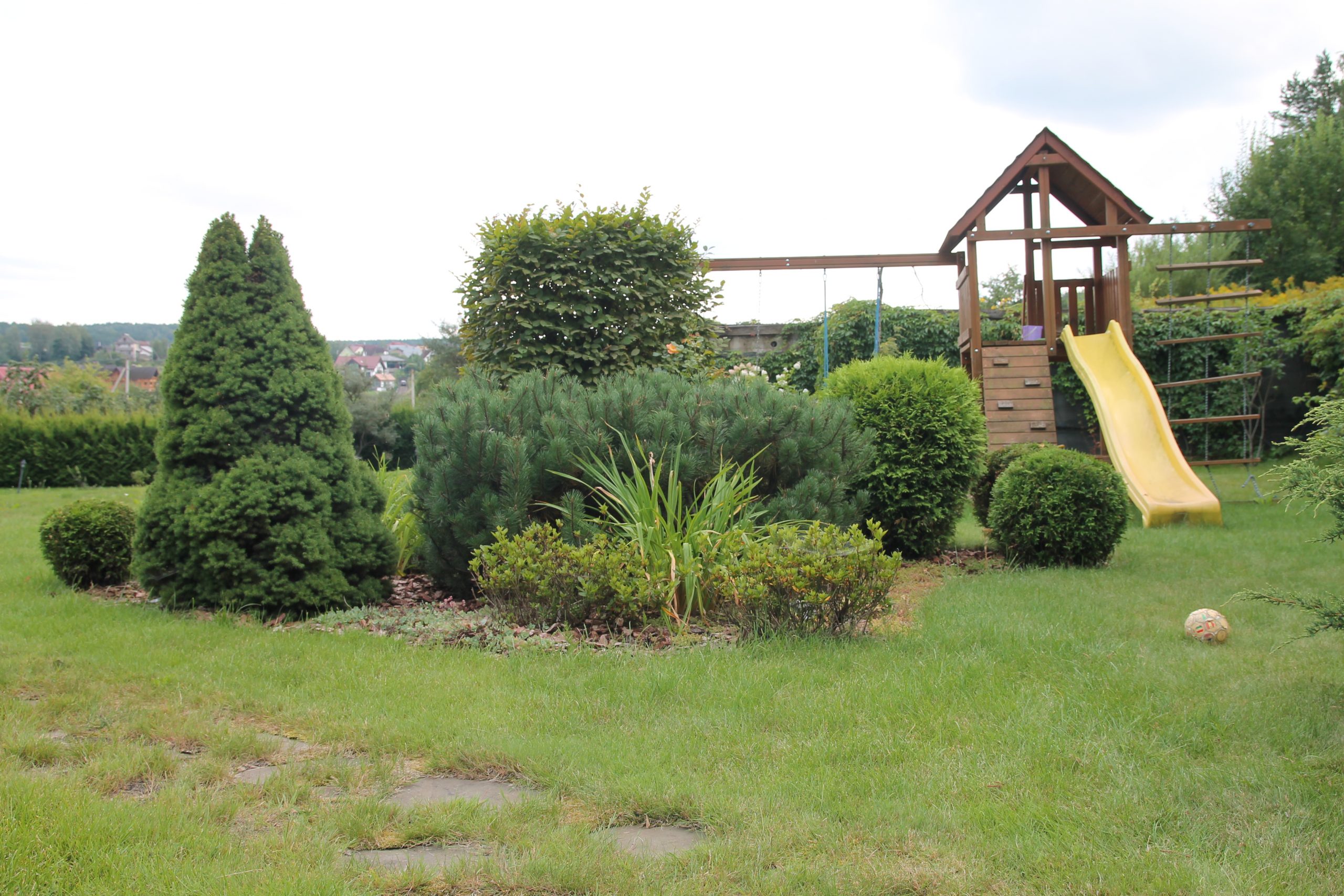 Сложный рельеф этого участка с перепадом в 7,5 м вдохновил нас на идею создания сада с разделенными по высоте тремя функциональными зонами. Они связаны подпорными стенами и газонными склонами.