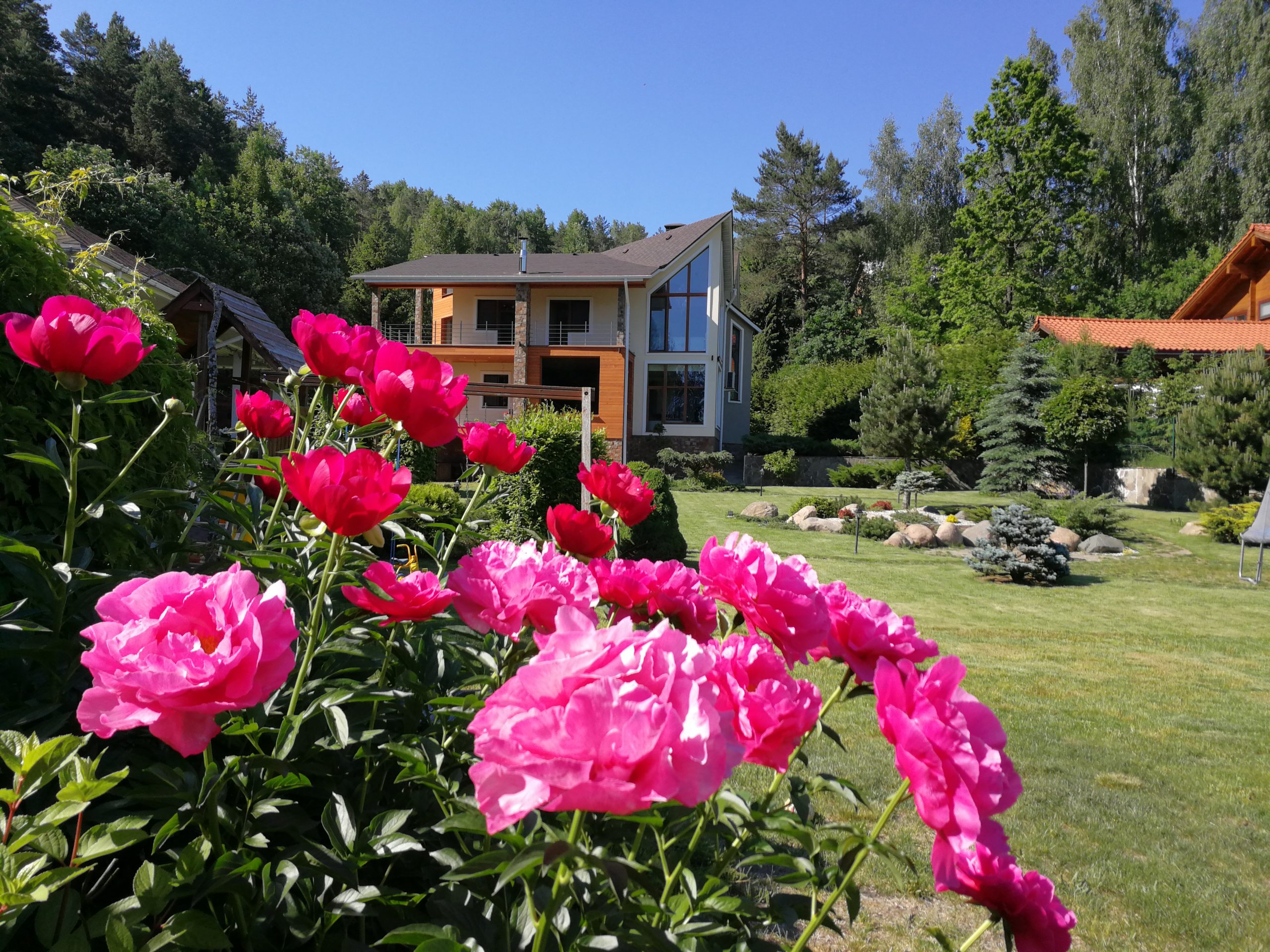 Площадка в зоне калитки и въезда на участок обрамлена невысокой изгородью из туй «Danica». Они создают рельефную глубину и объединяют отдельные группы растений – тюльпаны, гортензии крупнолистные Bouquet Rose, пионы, английские розы и лаванда – радующие взгляд розово-сиреневыми переливами соцветий уже с мая и до морозов.